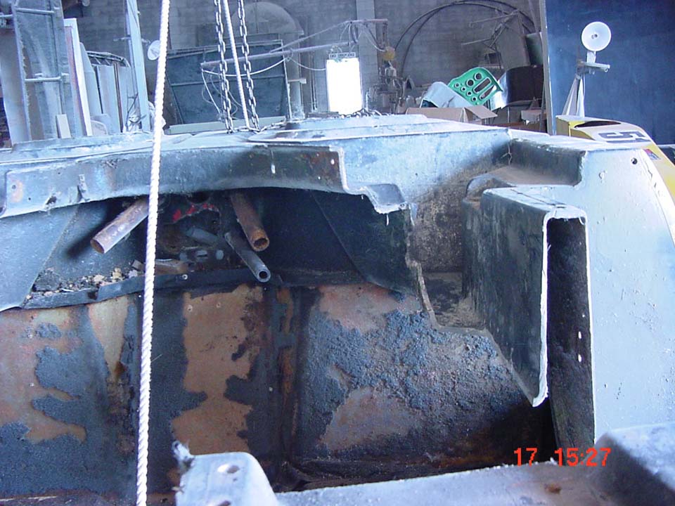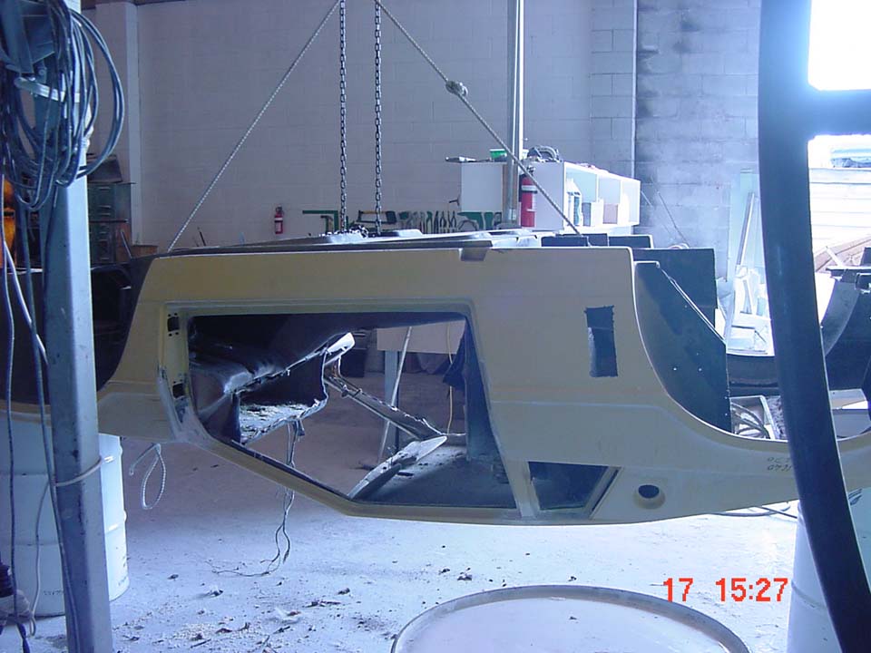 Heron #2 at Rotorua Fibreglass Industries, suspended upside down! This is in order to more easily fit up the engine, gearbox and rear suspension.